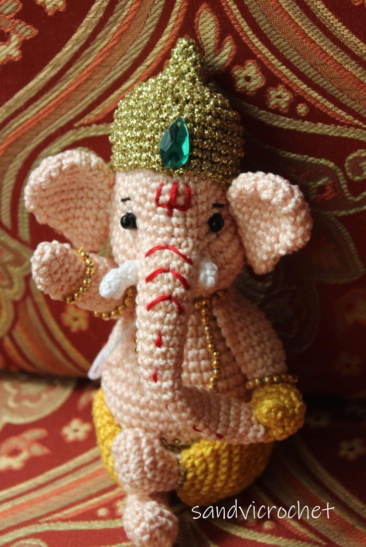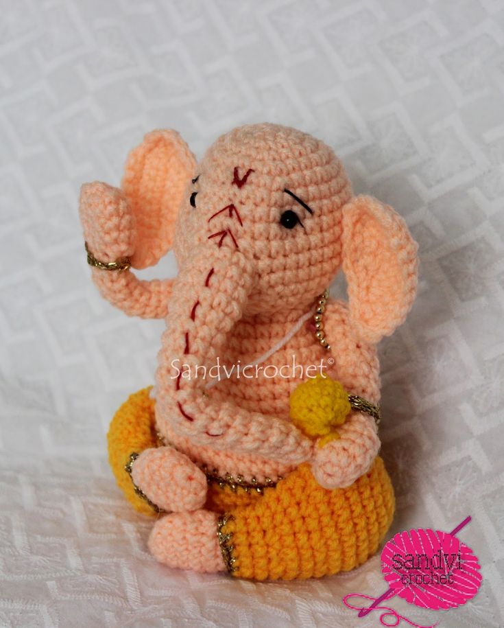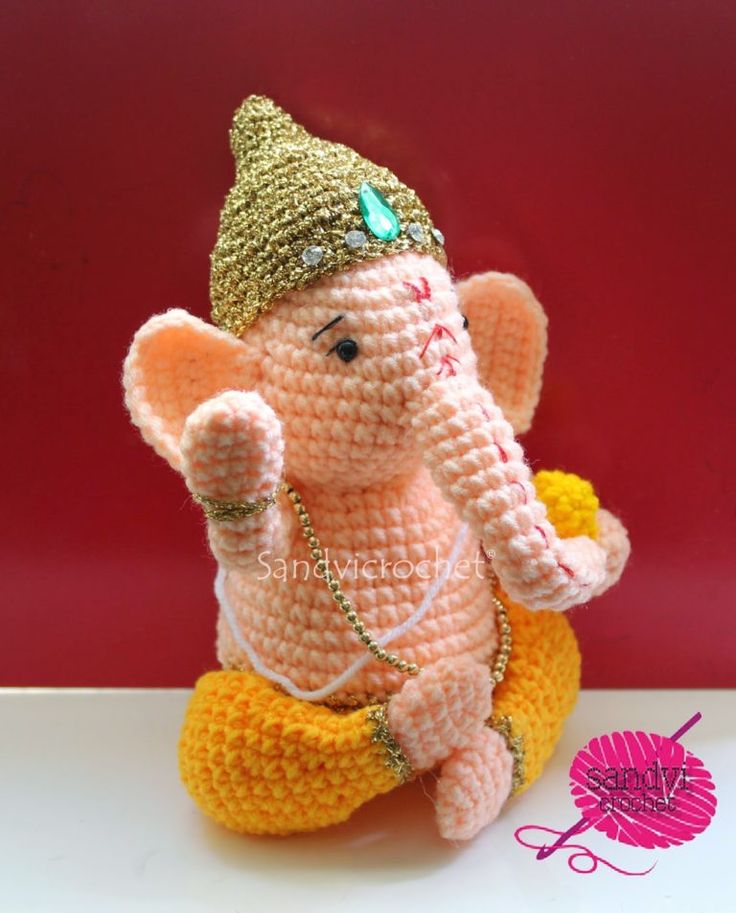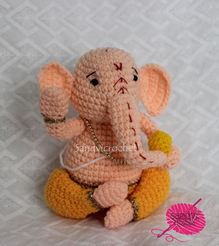 Made from soft, high-quality yarn, this Ganesha doll features intricate details such as a golden crown with gemstone embellishment, traditional ornaments, and delicate embroidery work that enhances its divine appearance. Whether you place it in your home temple, use it as a decorative showpiece, or gift it to loved ones on auspicious occasions like Ganesh Chaturthi, housewarmings, or weddings, this crochet Ganesha will surely bring joy and positivity.